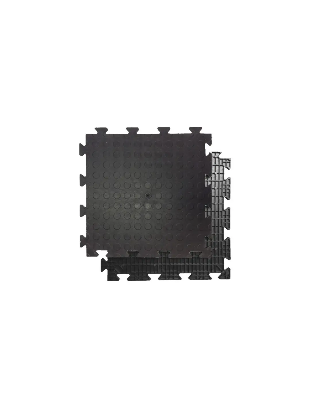 Interlocking PVC floor tiles with a raised-disc surface.