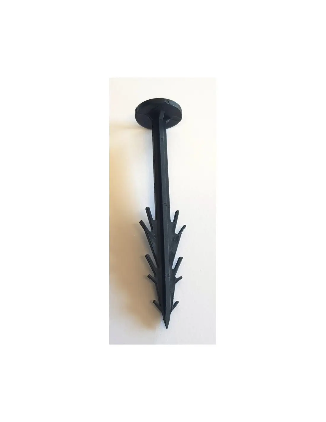 A pack of 100 plastic fixing pegs for fixing rubber matting and mesh to soil and turf.