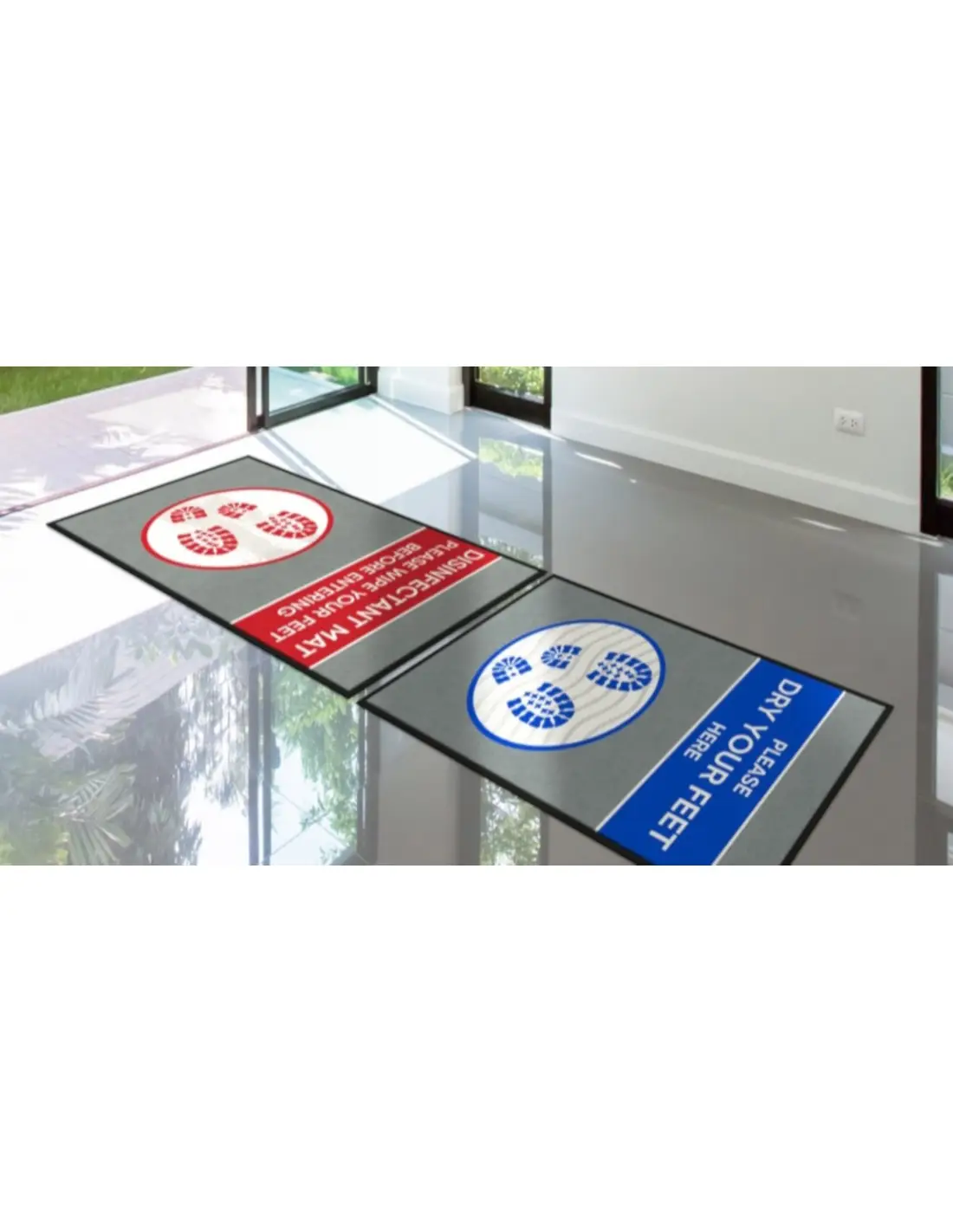 A two-step disinfection solution for cleaning shoes upon entry to a building. The disinfectant mat is sprayed with disinfectant (not included) and kills any viruses or bacteria present on the shoes of people entering a building or room. The shoes are then dried on the second mat to keep the floor dry and reduce the risk of slipping.