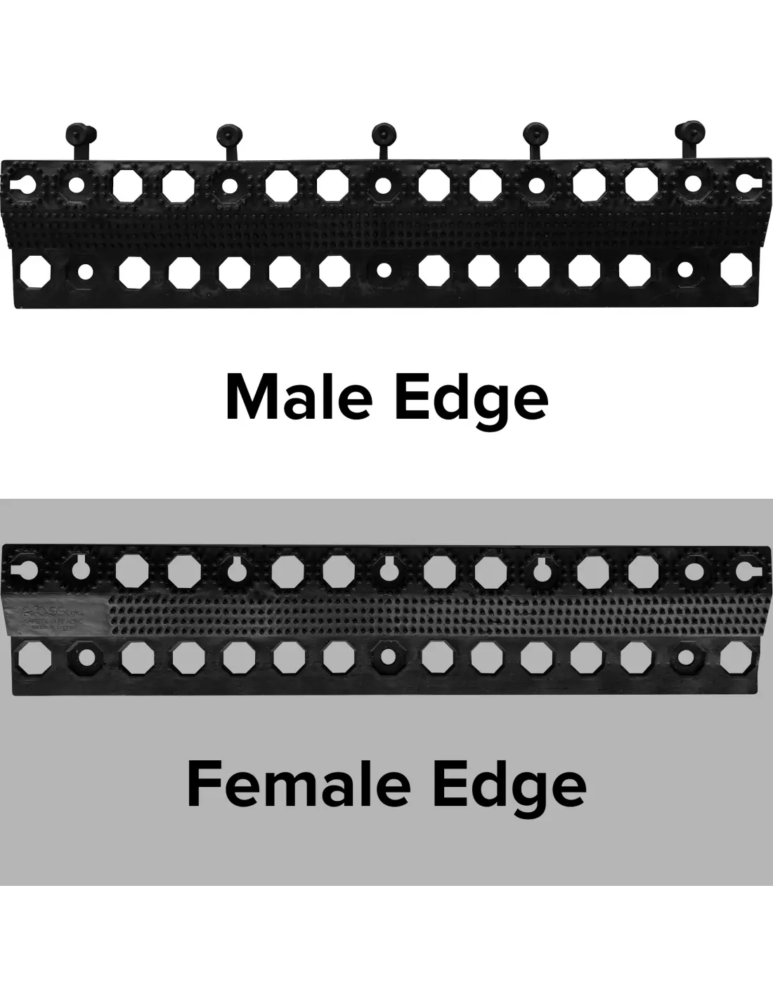 Ramped edging for GrassLok and PaveLok products to facilitate wheeled traffic and reduce the risk of trips and falls. Male edges attach to female edges of the mats, and vice versa.